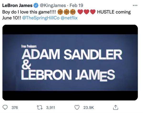 他的影视公司与Netflix协作的新电影要借全明星的机会上线预告片,NBA当然也得不遗余力帮宣传。尽管《太空大灌篮2》口碑票房都砸了,但这部新片勒布朗只做制片人,主演但是业内A咖亚当-桑德勒。