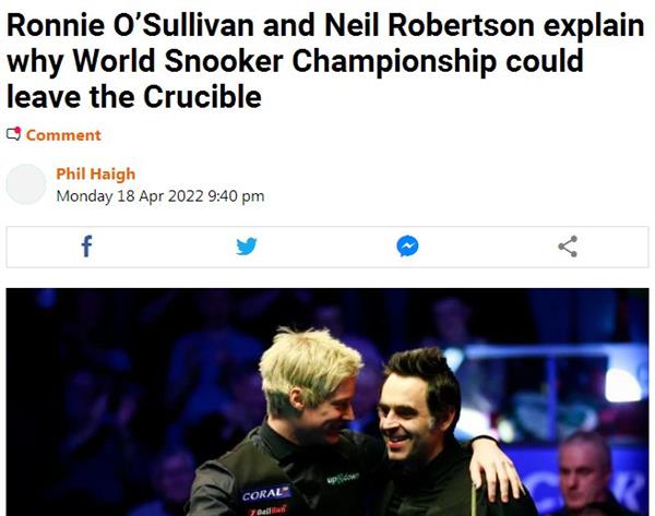 斯诺克世锦赛在克鲁斯堡举行已经成为传统,但在本届世锦赛期间,罗伯逊和奥沙利文都表达了世锦赛能够脱离克鲁斯堡的情绪,尤其是奥沙利文,点名只要由我国承办才能将世锦赛打造成像网球和高尔夫的大满贯赛事。