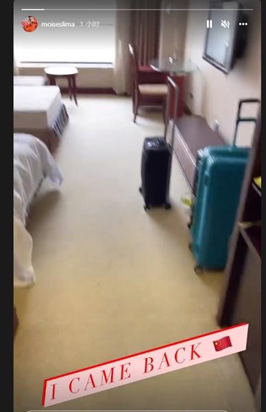 莫伊塞斯在社媒中晒出了他在阻隔酒店的房间相片,并配文“回到中国了”。