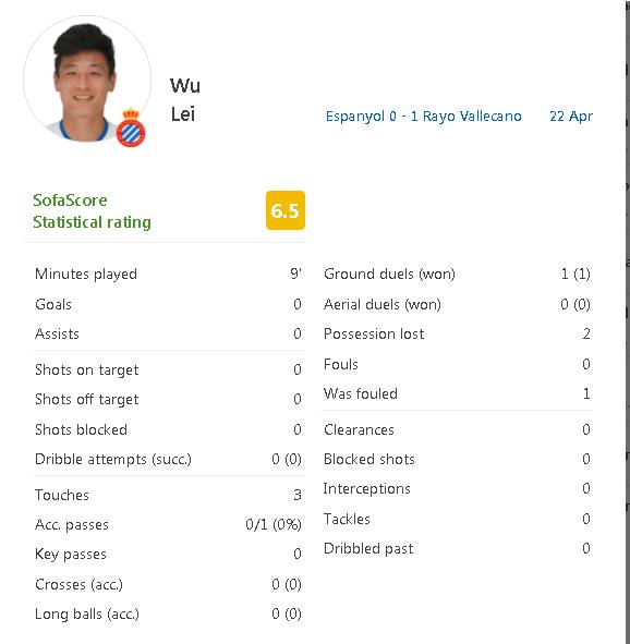 数据显示,武磊本场比赛踢了9分钟,只有3次触球,1次传球,没有传到位。